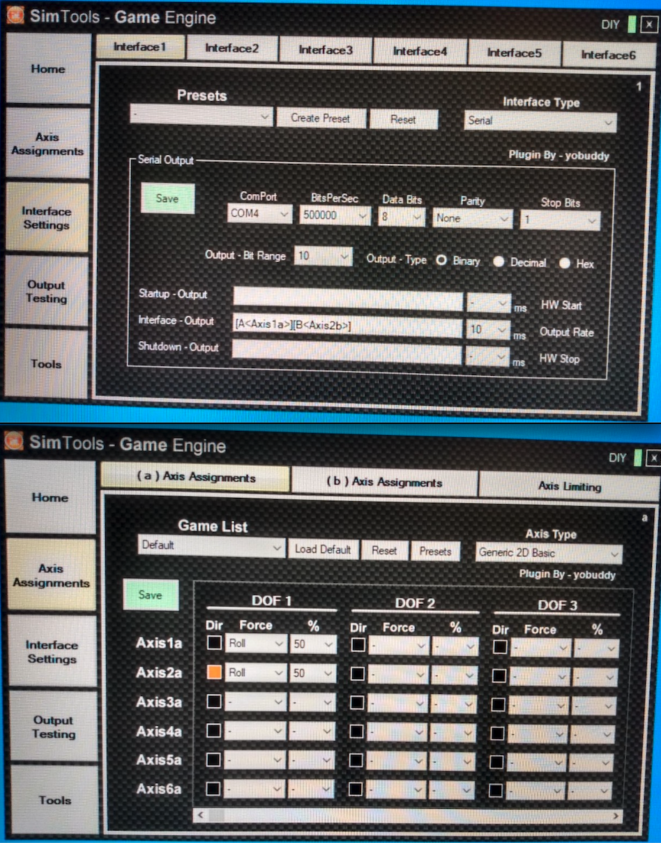 I'm new to SimTools myself, but I believe your interface-output should read [A<Axis1a>][B<Axis2a>]