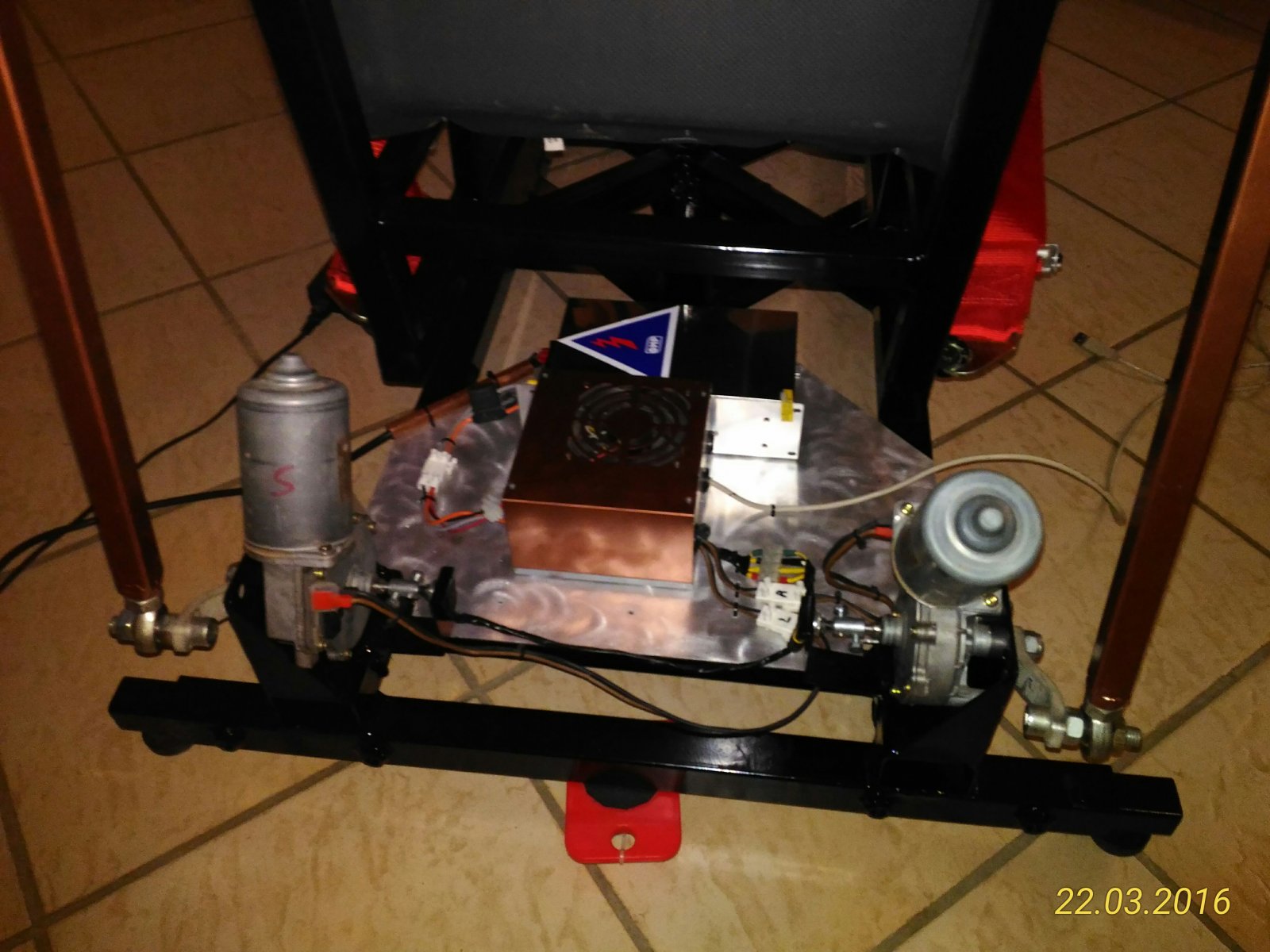 I present my "sim 2 dof". For my homemade simulator, I chose the iron rods of 35x35mm sp.2mm size for the base and 30x30mm and 20x20 sp.2mm for the upper float. The all welded.