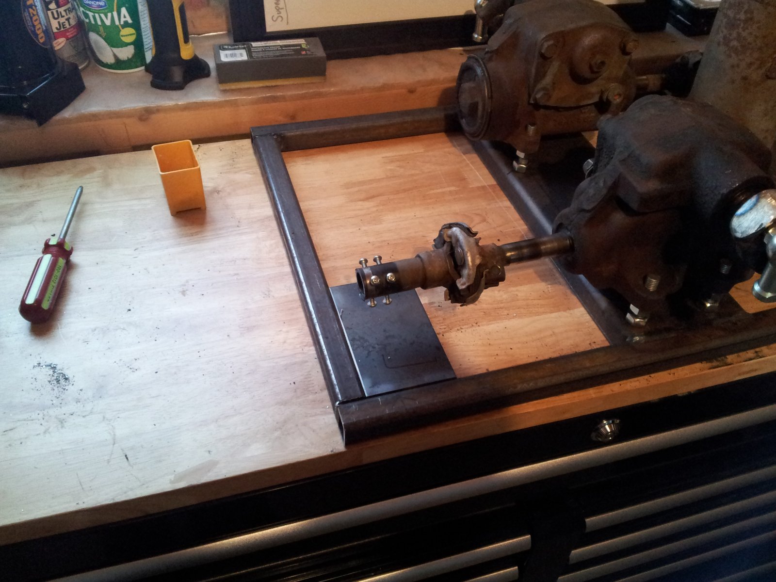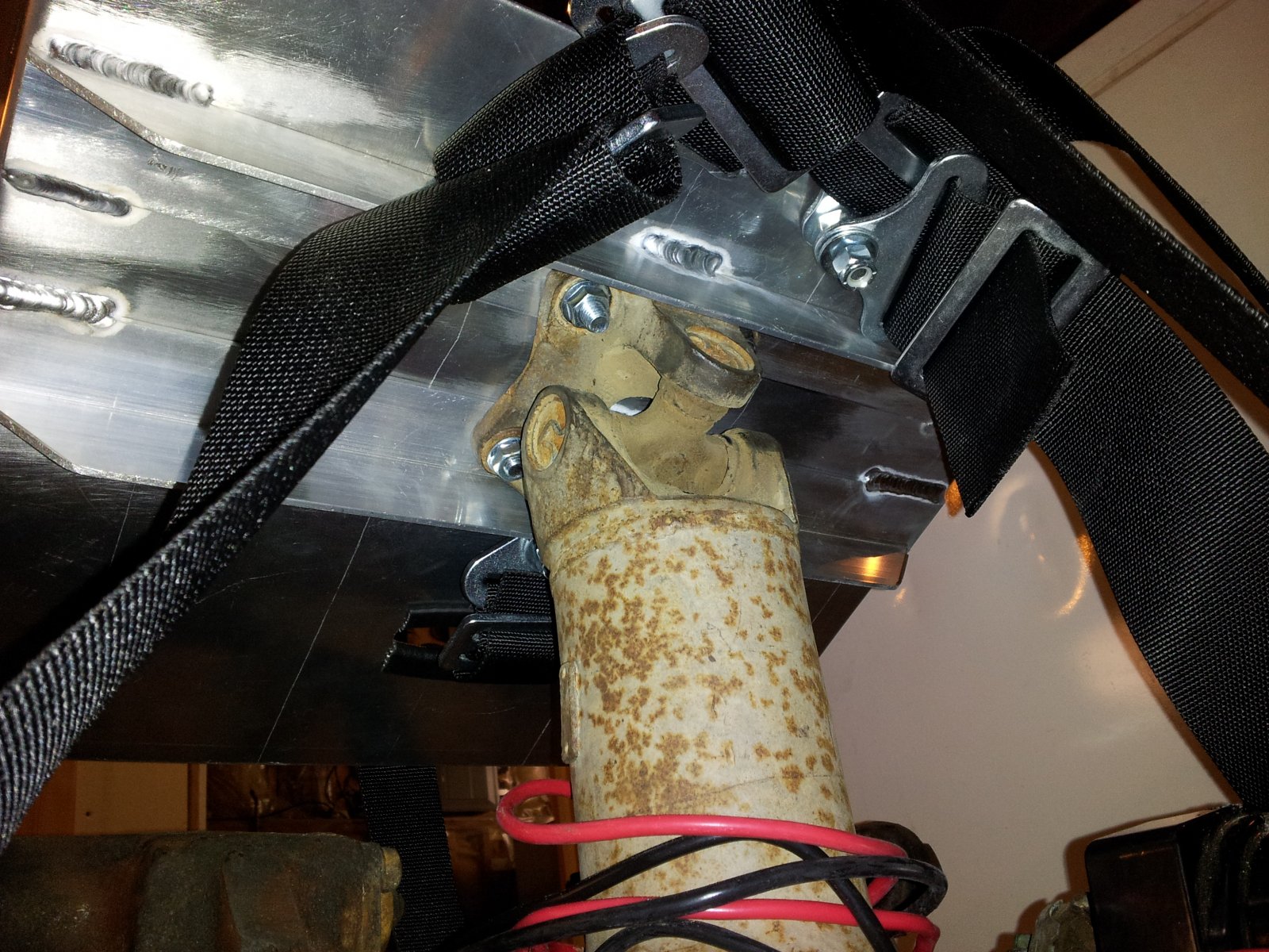 The aluminum frame fits nicely over the u-joint. I drilled the mounting holes out to a large size so that I could put rubber washers in there and isolate the vibration of the Buttkicker to the seat as much as possible. I haven't figured out how to mount the Buttkicker to the seat yet, as I got the gamer edition and it just has a clamp.