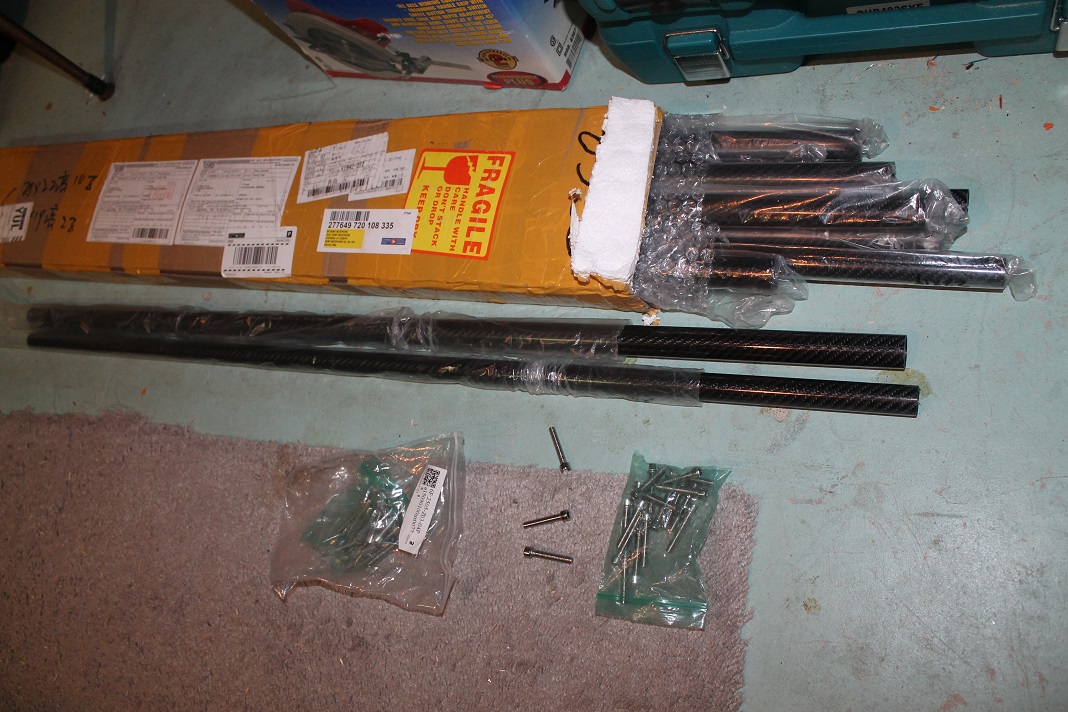 Carbon fiber tubes. 25 x 22 x 1000 mm and 22 x 19 x 1000 mm. 10 of the first, 2 of the other. The smaller one will be used to connect the bigger one. The goal? Build a new platform. For those who says: "That's a good idea, I should do the same." Let me tell you that this costed me $520 CAD in carbon, and I want to by more after the Chinese holiday (plates), not to mention more than $200 CAD in glue and accessories. The screws are 6mm for the wheel and pedal fixation. We are not well suited in metric providers around here.