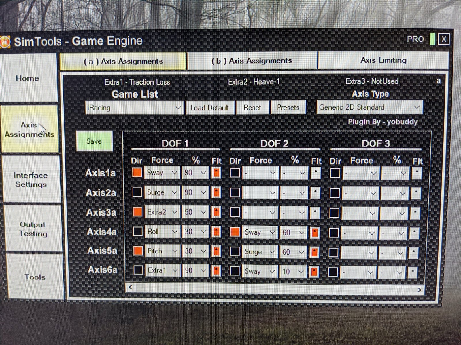 I have attached a screenshot of my Simtools as it was for iRacing, this illustrates the force and direction for each axis as well how I blend 2 forces into an axis. obviously each game will be different, but this is a good starting point.