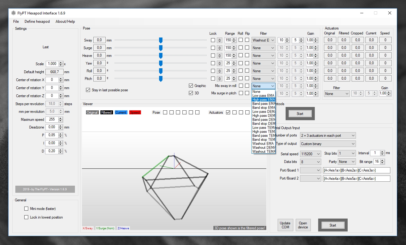 FlyPT 6DOF/Stewart/Hexapod Interface for linear and rotating actuators