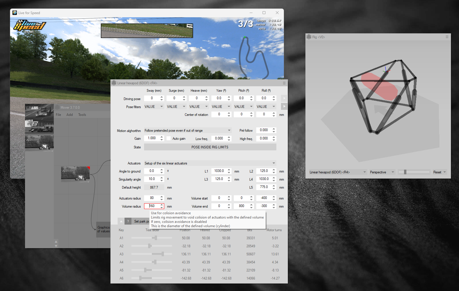 So question: I have a 6DOF hexapod and the pedal mount is outside of the actuators but below the COR and the top of the actuators. This means that there are some extreme angles where it would interfere with one of the actuators in the front. So i have to limit the angles/moves to ensure there is never interference between my rig and the pedals.