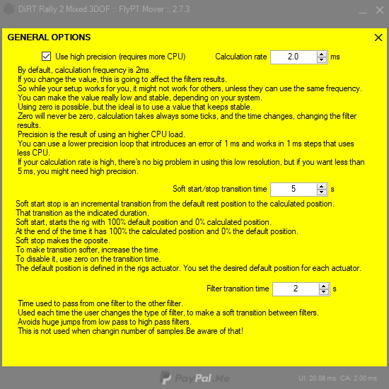 There's a DiRT Rally 2 sample for hexapods in the download. Honestly, I wanted to fine tune it, but can't even reach near the rig in the next days. Use it has a base.