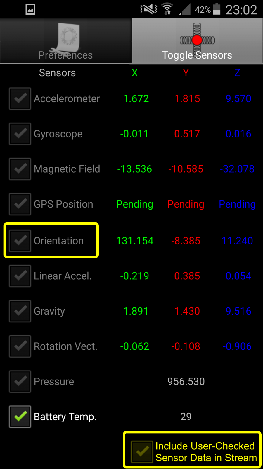 The Accelerometer is automatically selected. If you want to add Orientation (pitch, roll, yaw), check the Orientation checkbox and the "Include User-Checked Sensor Data in Stream"-checkbox.