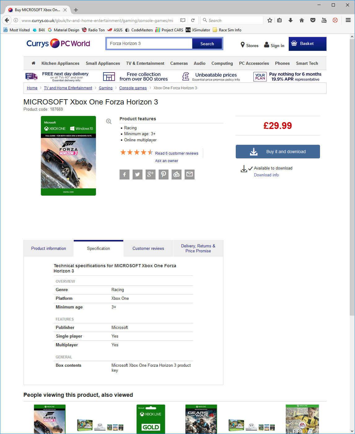 Also, if you like Forza Horizon 3 then Curry's is currently retailing the download PC/XBox One version for £29.99 which is another reasonable saving over standard retail price....