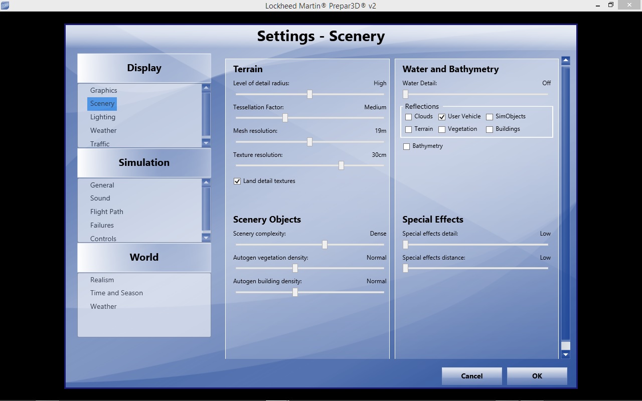 Keep in mind all of my settings are tweaked for my GTX 970 card and the OrbX addons I run, and these settings give me a smooth VR experience. But different hardware would make a bit difference, so just use it as a general guide on balancing the need for high FPS and graphics quality forP3D VR.