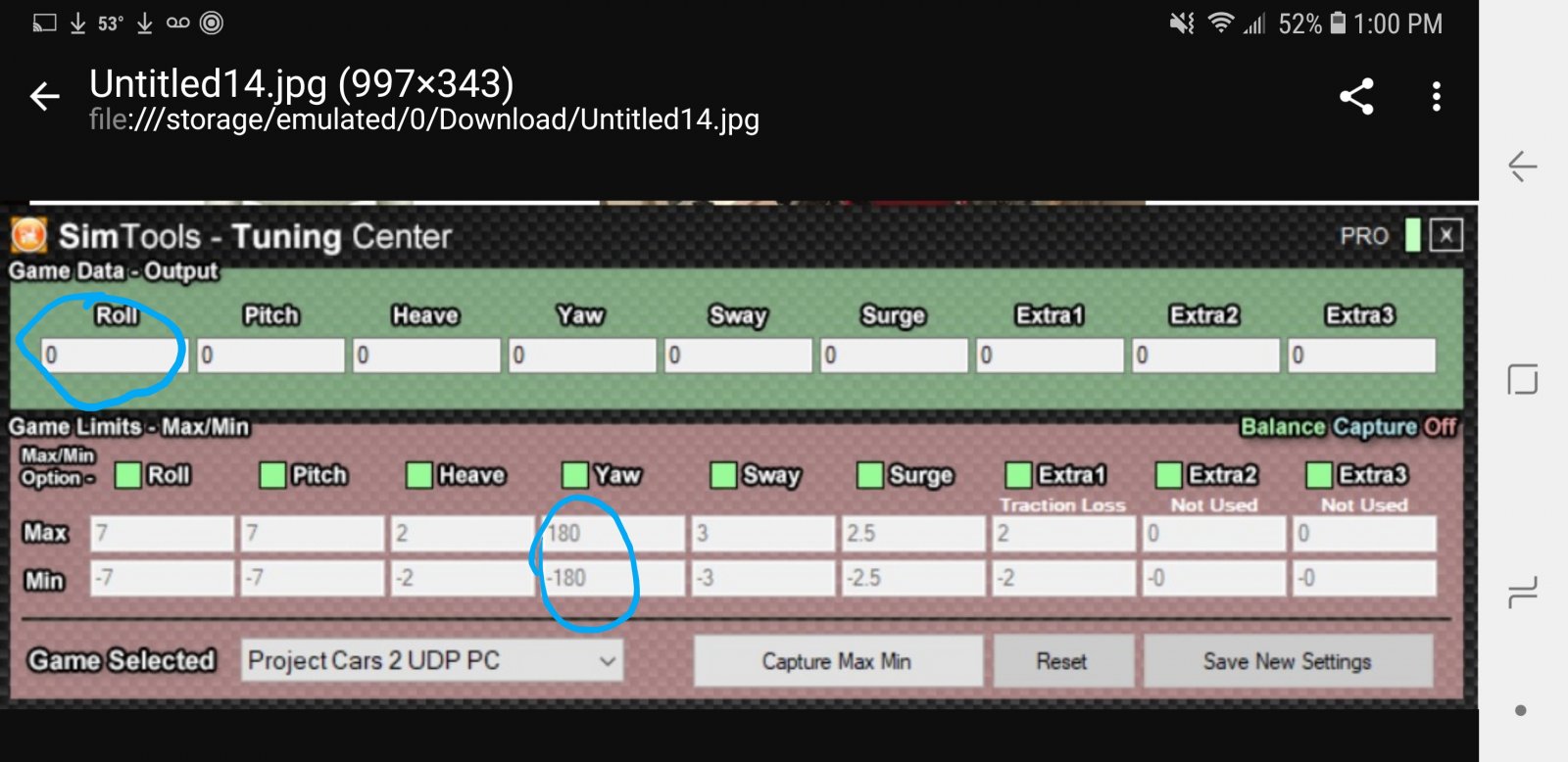 If I set the values of my two axes (axis 1 and 2) in this way 15 roll, 15 pitch, 25 surge, 30 heave, 35 sway then altogether about 120. With these values assigned within the game and in tuning center imposed "capture max-min". I drive on the track without exaggerating and save the values that result. So I return to play with values saved here in tuning center but the simulator is not very reactive.