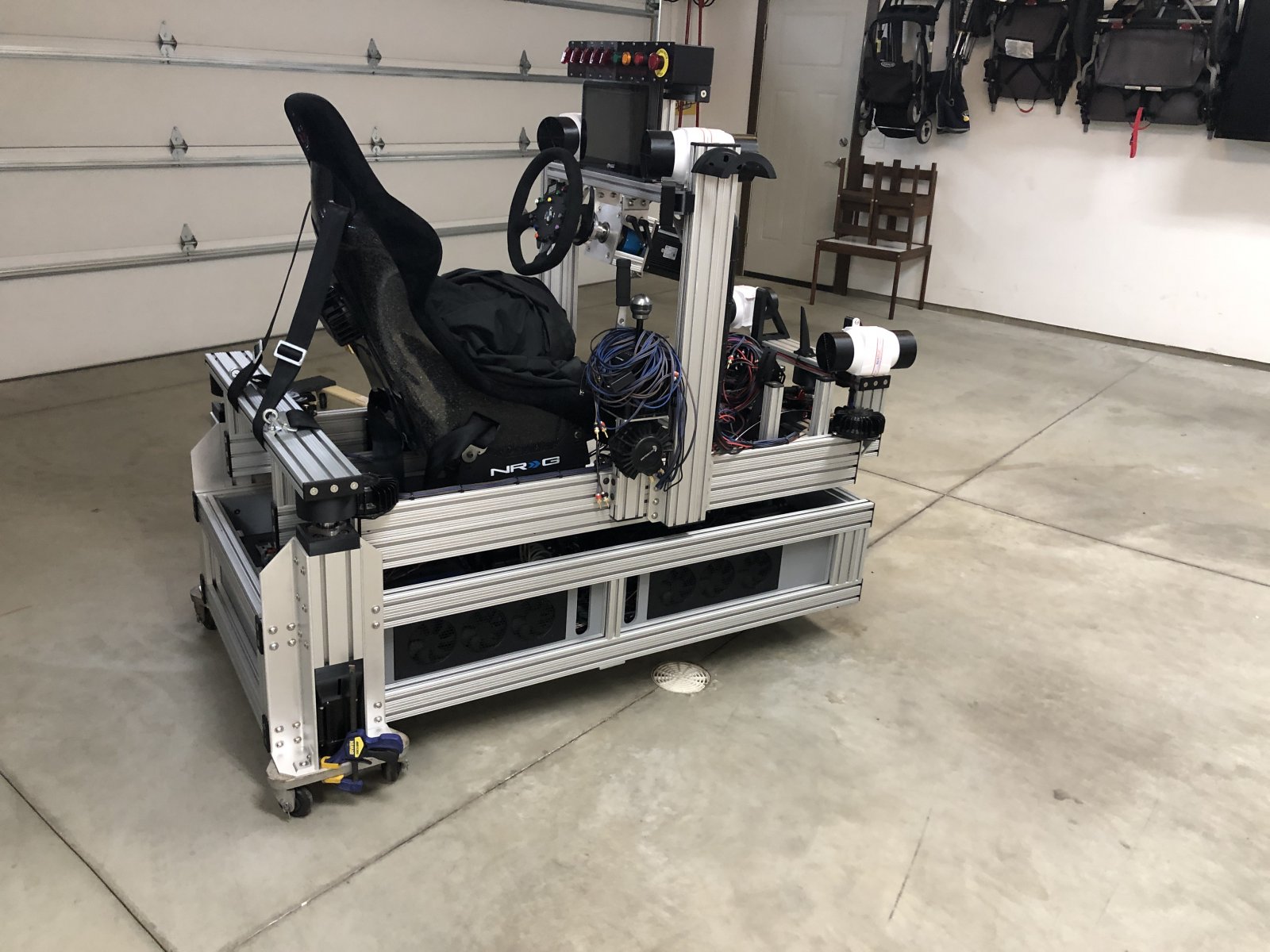 So after a few nights of software installation, firmware updates and hardware diagnostics I finally put it all together. Last night I did about 2 hours of racing with everything working (only 6 transducers). It was pretty awesome. I am still running my reverb G2 in potato mode in order to keep the FPS at 90, It definitely leaves a lot to be desired as far as visuals go, but the combination of VR, Motion, Fans, Vibration and the OSW is crazy fun. I still have a lot to do but I cannot wait until this thing is ready for every day use.