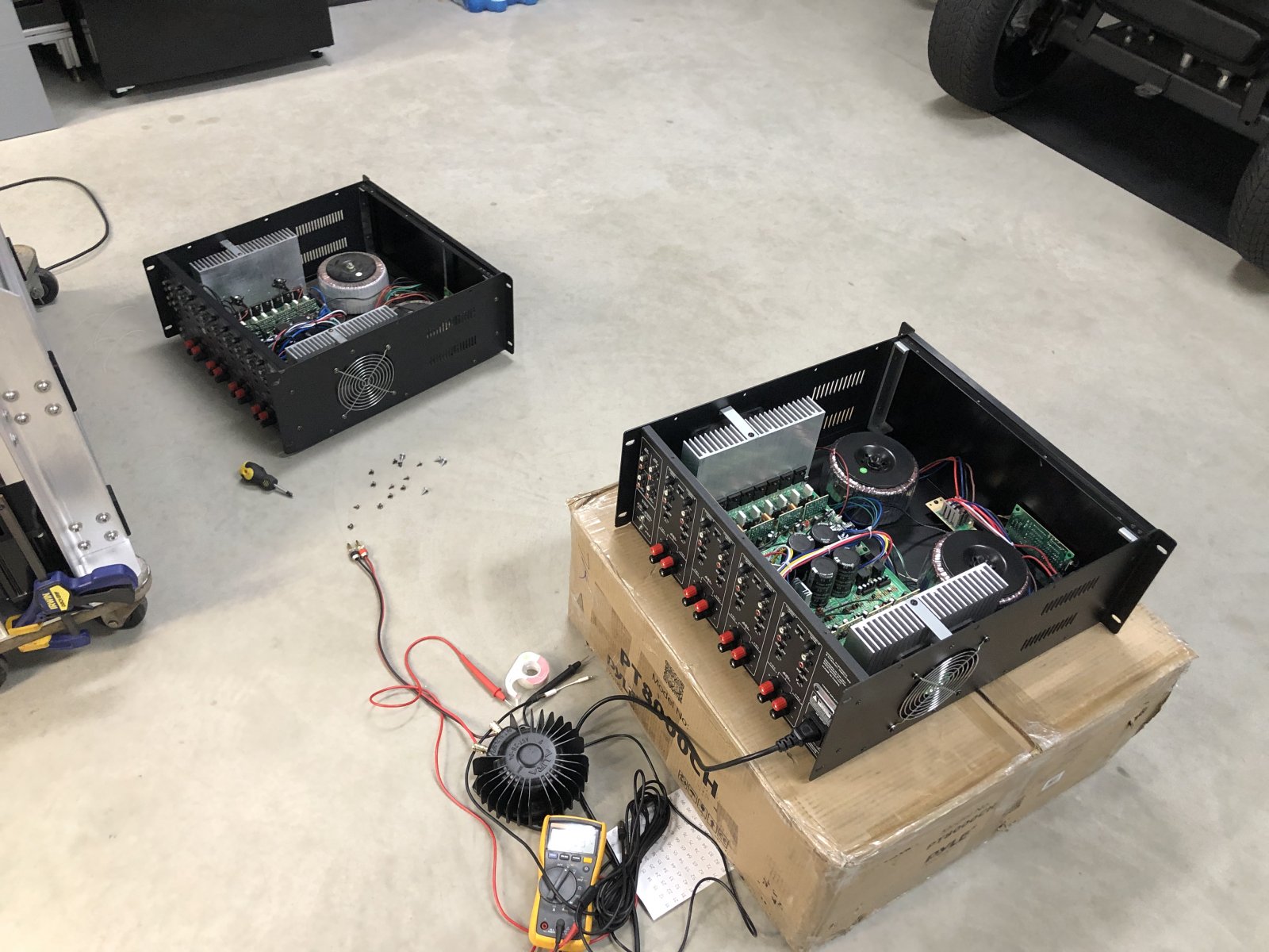 I did some initial testing of the new amp to make sure all 8 channels are were working. The old amp would max out at about 42v AC with a 0db 50hz signal coming from my iphone. The new amp was spot on at around 42 volts at max gain. I also hooked up a transducer just to play around with it. My transducers are all rated for 50w each so when I setup my new amp I set the output voltage at the terminals to 14.5 volts. that should give me just over 50w. I was initially struggling to get a high enough gain with my two sound blaster audio cards, but I was able to turn off all the EQ features and boost the volume enough to easily hit my 14.5 volts.