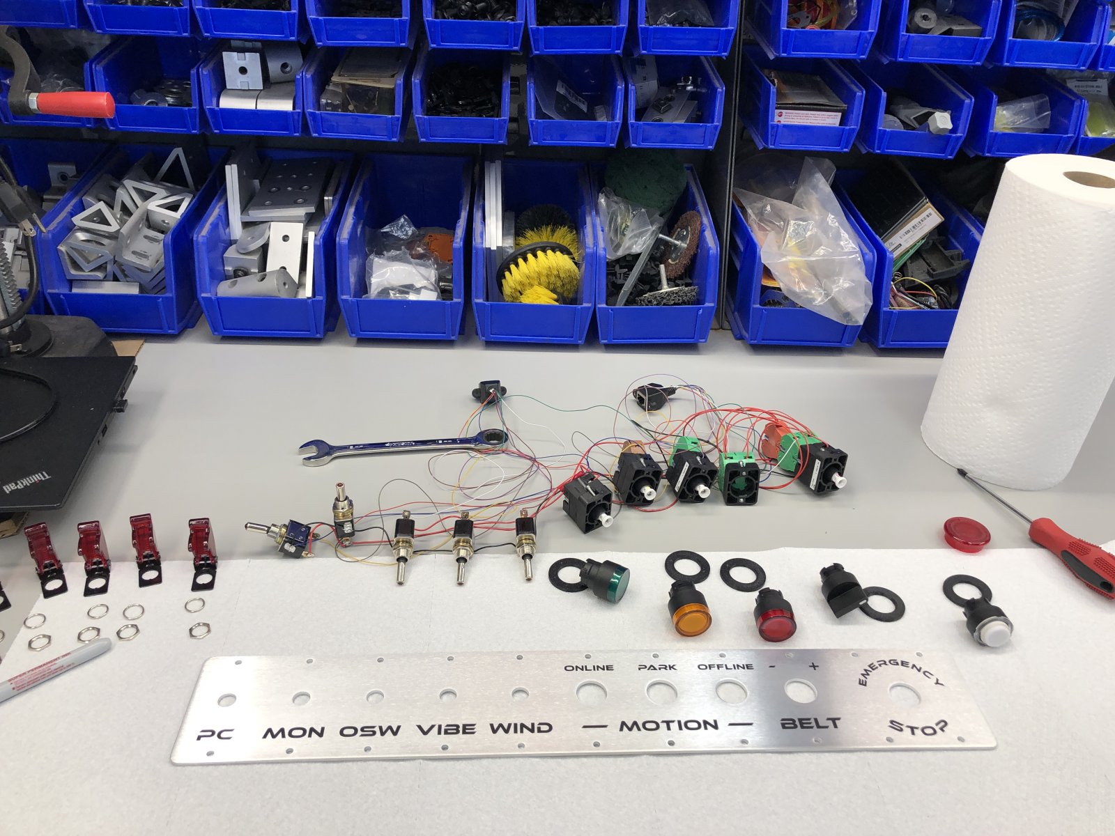 First, the switch box panels aren't to my liking. I tried a few different things with my 3d printer and I'm not happy with any of them. Its hard to see in the picture but I tested some different surfacing techniques and even some clear coats. Ultimately I think a single piece aluminum plate with machined text that is back filled with red paint would be just right, but for time and efforts sake I will probably stick with 3d printing. Also the emergency stop mushroom button broke of randomly, I will need to fix or replace that.