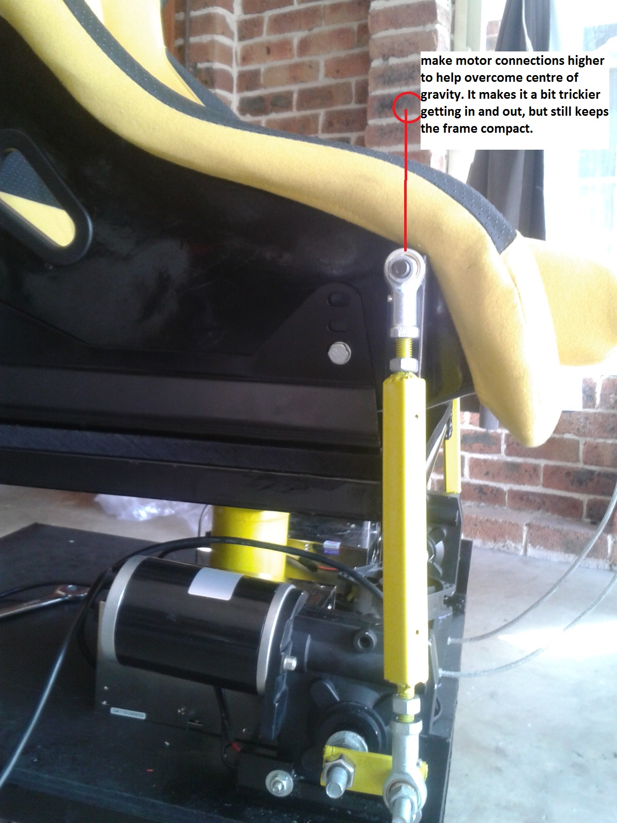As for getting in and out , in that case, make them as high as you can without going to shoulder height, so above knee height if your knees are higher than your belly or belly height is gut is above knees would be ideal. The bass shaker would need to be moved. I think @Nick Moxley has good ideas where they can go. He did a static to seat mover conversion as well, but with shoulder mounted motors