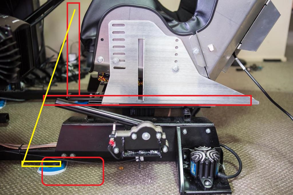 I will move the bass shakers up on to the top frame. Not sure what I will do about the big bass shaker under the seat. Maybe have it back behind the pivot or extend the top frame out behind the back of the seat a bit.