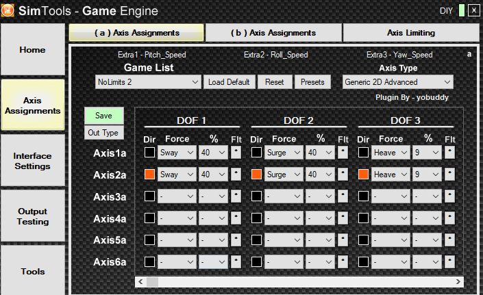 Example: Axis1 = 40 (sway) + 40 (surge) + 9 (heave) + 40 (roll) + 40 (pitch) = 169