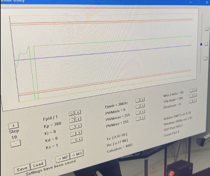 9. Now slowly, increase PWMmax… at some point the motor should start to move. When it does check the “Green” feedback line is moving toward the “Blue” target position.
