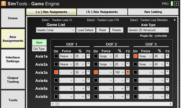 I didn't take my thought process past more than the two motors so I believe you need a 'c' axis assignment now too to solve all your issues when using only Simtools settings if I'm following correctly what you need. I requested consideration of using a multi-windowed approach for the tuning center so someone could just add another assignment when necessary (considering their computer has the processing resources) but getting a second one is already a 100% improvement. Again I don't think anyone considered using it like you are but with at least one more assignment you could then have a third sway dof that uses its full range so you could get both accel and decel motion at the back while not affecting the seat motors.