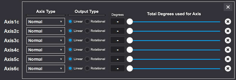 The Advanced Axis plugin allows the user to put an Axis in Normal. Gain Only, or Decrees Only mode. When in Gain Only, or Decrees Only mode, the full range of the axis is used with only the positive inputs from a given DOF. Gain Only mode moves the axis from negative to positive (usually extending an actuator), where Decrees Only mode moves the axis from positive to negative (usually collapsing an actuator).