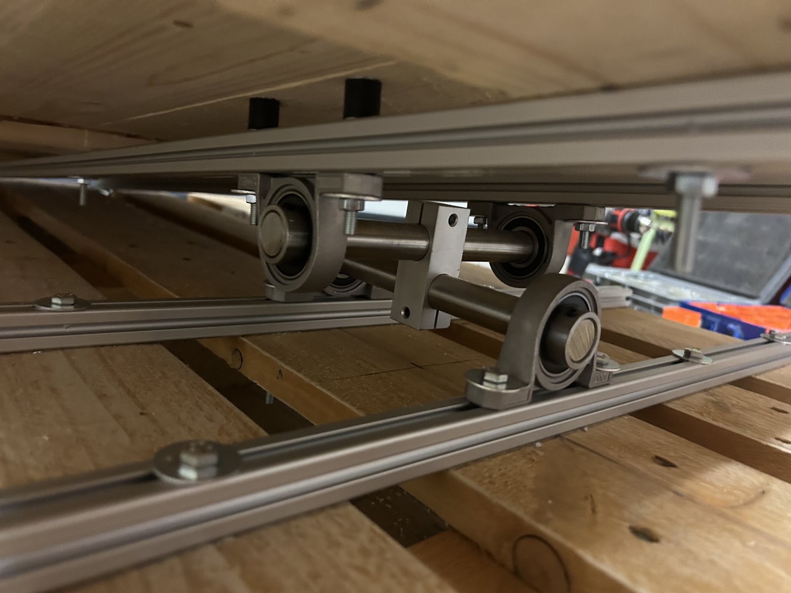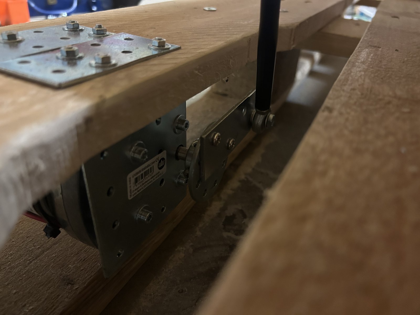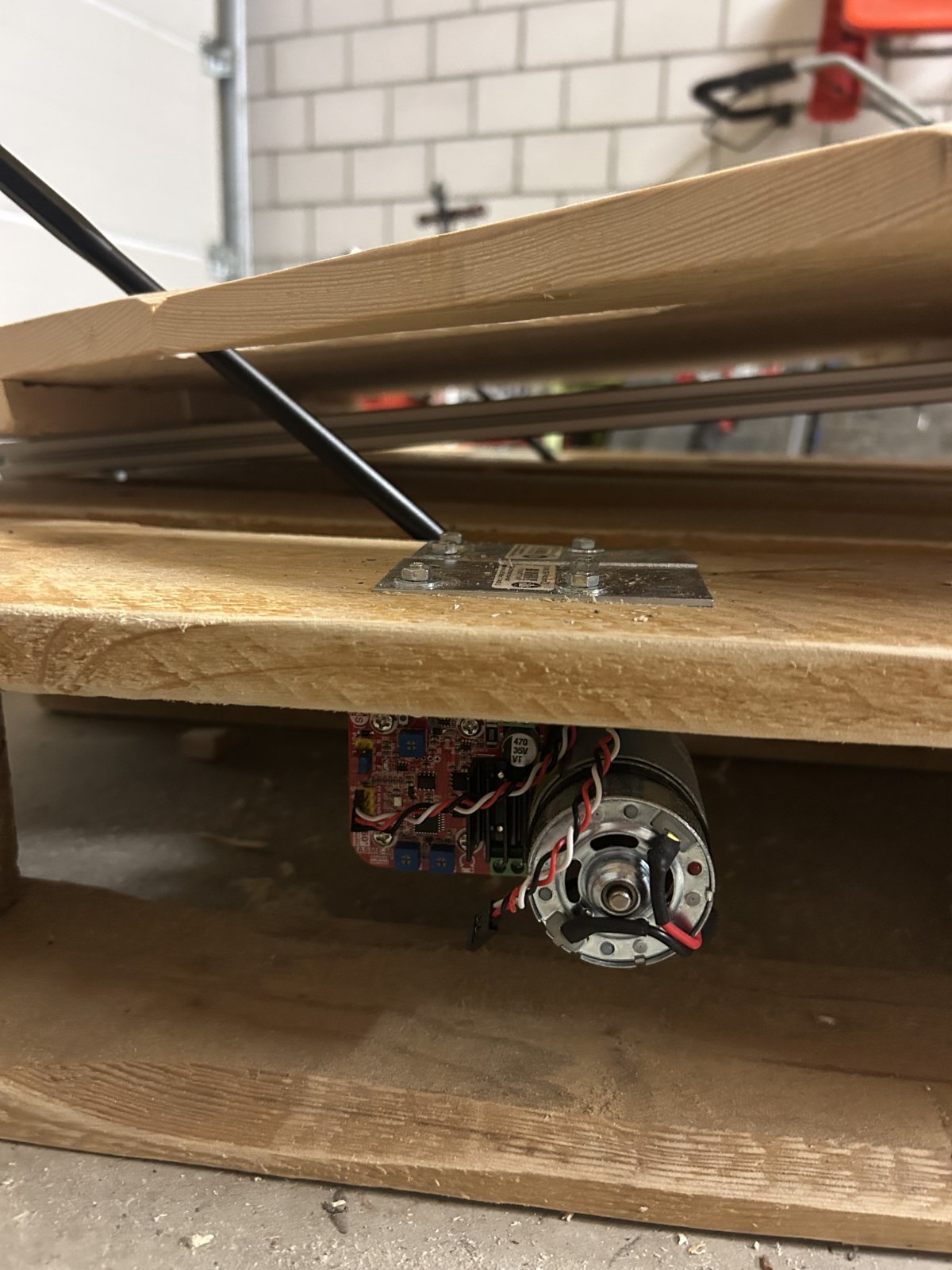 To spread the weight to the whole pallet, i mounted it on two 20x20mm aluminium rails. The motors are mounted with a metal angle, spared out a bit of the wood of the pallet, so that it still will be possible to move the simulator with a pallet truck.