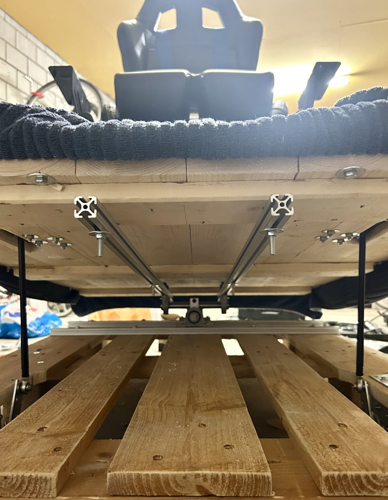 The pallet lid gets the same treatment, aluminium rails for stability, main joint positioned directly under the seat position.
