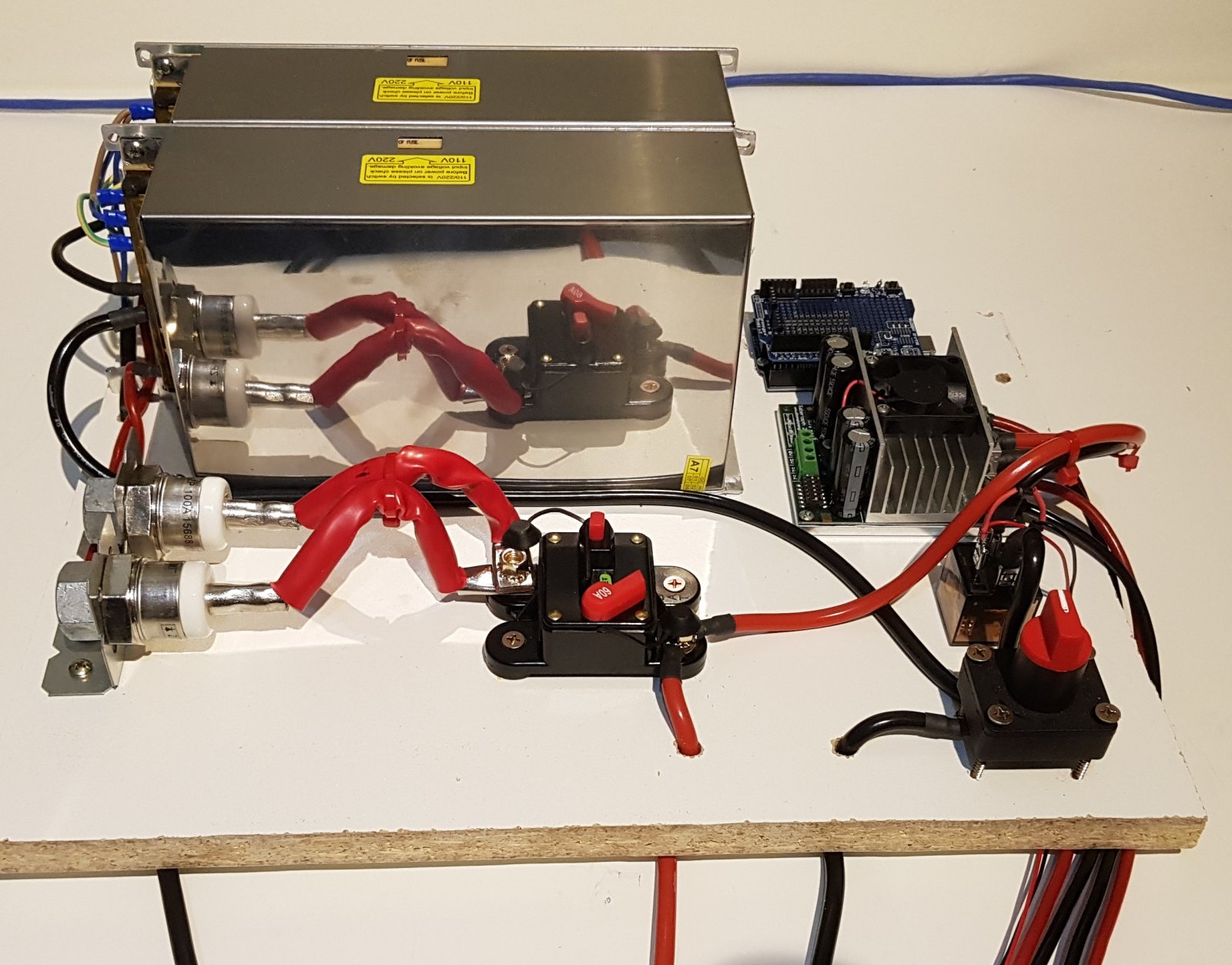 I mounted the power components on a 400x300mm particle board. - image 3 - it will eventually sit on top of the batteries. This is wired up according to the schematic I posted some weeks ago. The thick wire is 8G and the thinner wire is 12G. According to wiring specs I should have used 8G everywhere because 12G is only rated to 20A. The 8G is rated up to 48A. Now the motors are rated at 24A each so this will work fine but the 12G is a bit under spec. I will have to see how it goes. The red / black 8G wire running through the holes in the foreground go to the batteries.