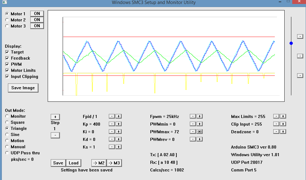 If someone is familiar with the SMC3 utility could you comment on the yellow line (PWM) spikes in the attached image. I still don't have the battery connected to deal with the regenerative current. The spikes occur when the motor changes direction so it might be related to the regenerative current? No sure how though as the Arduino isn't monitoring the motor side of the Sabertooth.