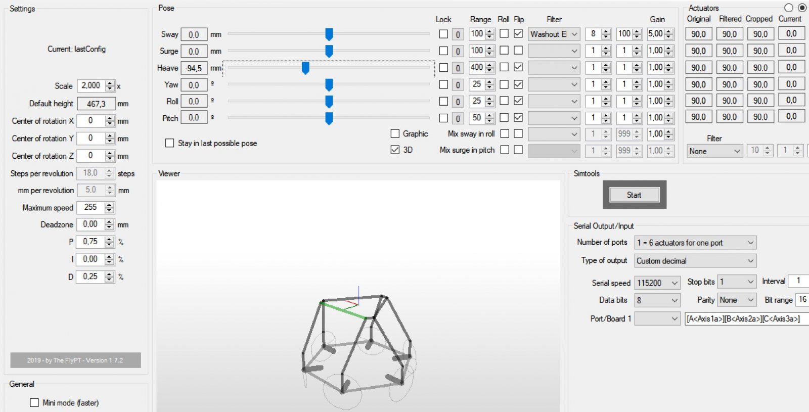 FlyPT 6DOF/Stewart/Hexapod Interface for linear and rotating actuators