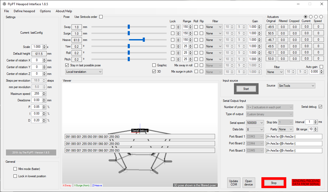 FlyPT 6DOF/Stewart/Hexapod Interface for linear and rotating actuators