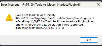"That error means the FlyPT → SimTools interface DLL is incompatible or blocked.