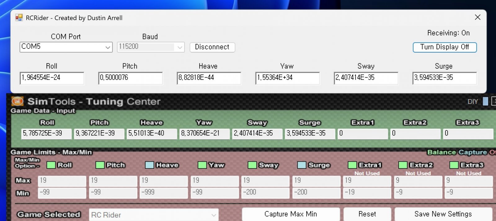 Got a bit problem, when I moved the imu and looking at RCRider.exe. I got good values, but in Simtools v2.6.1 in Tuning windows I'm getting values but without commas or dots. example, in RCRider a value is 15.750 but in Simtools getting 15750 (without a dot). I saw video in this thread, in the Tuning windows has both of them. Matches between RCRider and Simtools.